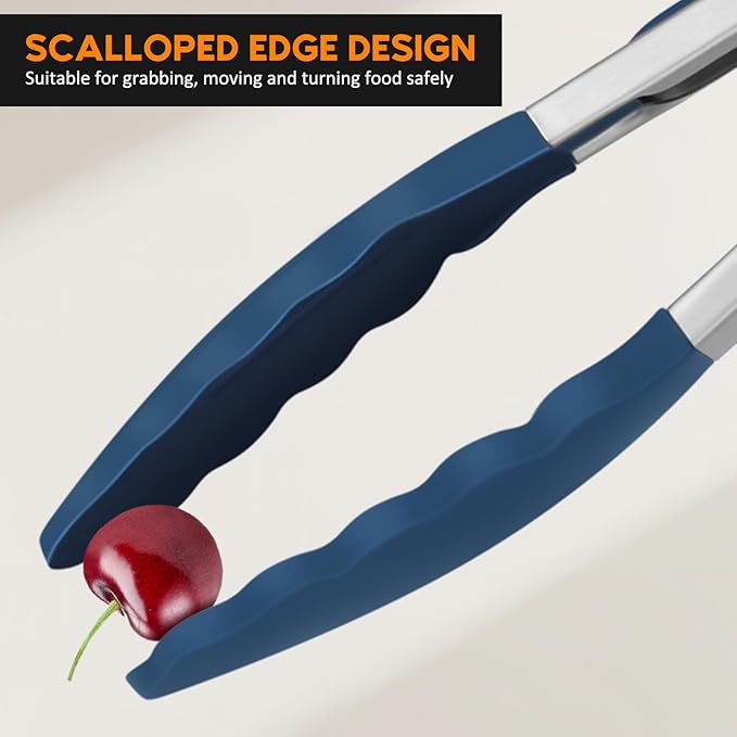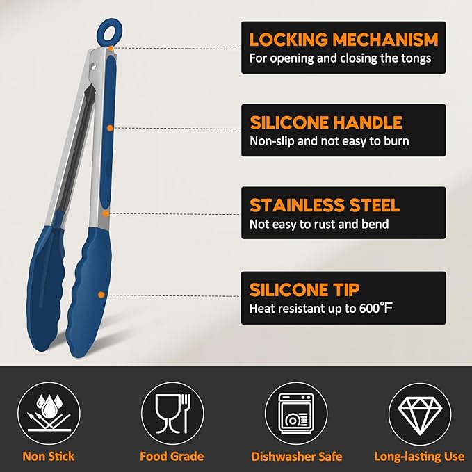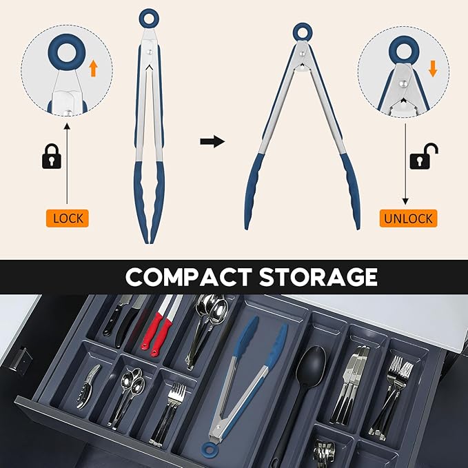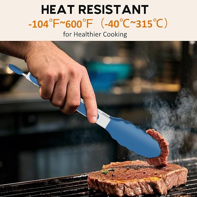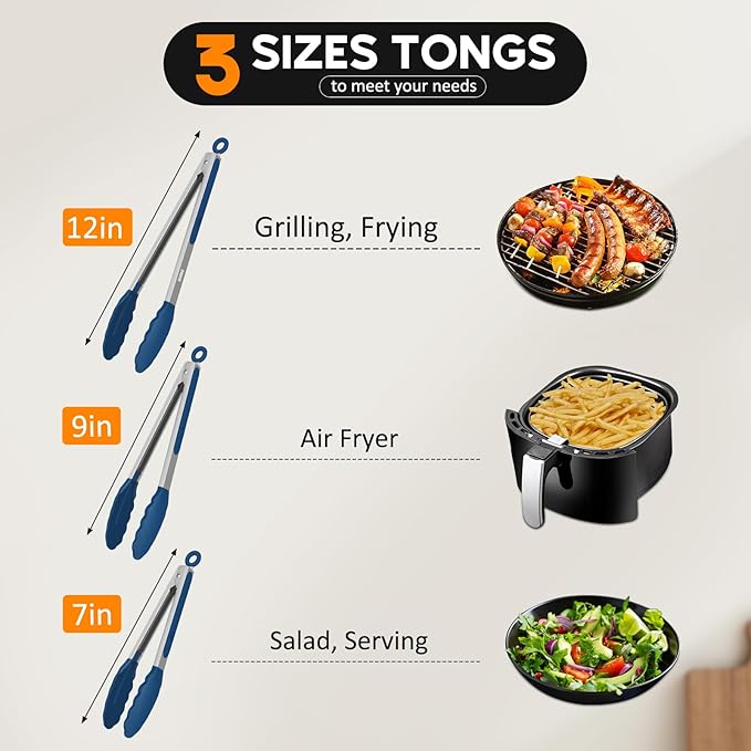 Kitchen Tongs, Set of 3 Stainless Steel Tongs with Silicone Tips Locking Cooking Tongs 600ºF Heat Resistant Tong for Cooking BBQ Grilling Air Fryer Serving Food Salads, 7"+9"+12" Classic Blue
