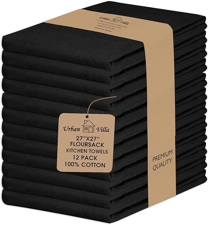 Urban Villa Halloween Flour Sack Kitchen Towels 27”x27” 12 Pack Black Color Dish Towels 100% Cotton Flour Sack Kitchen Towels for Embroidery DIY Projects Cloth Diapers Cheese Strainers Dish Cloths