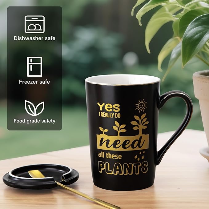 Crazy Gardening Gifts for Women Men - Plant Lover Gift Coffee Mug, Garden Gifts for Gardeners, Plant Lady, Mom, Dad, Son, 14oz Black Ceramic Mug with Gold Print, Lid, Spoon Card, Luxury Gift Boxed