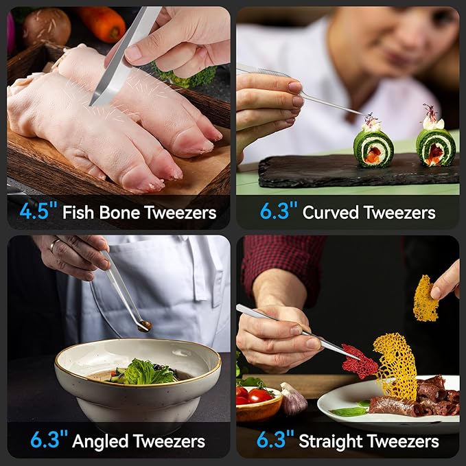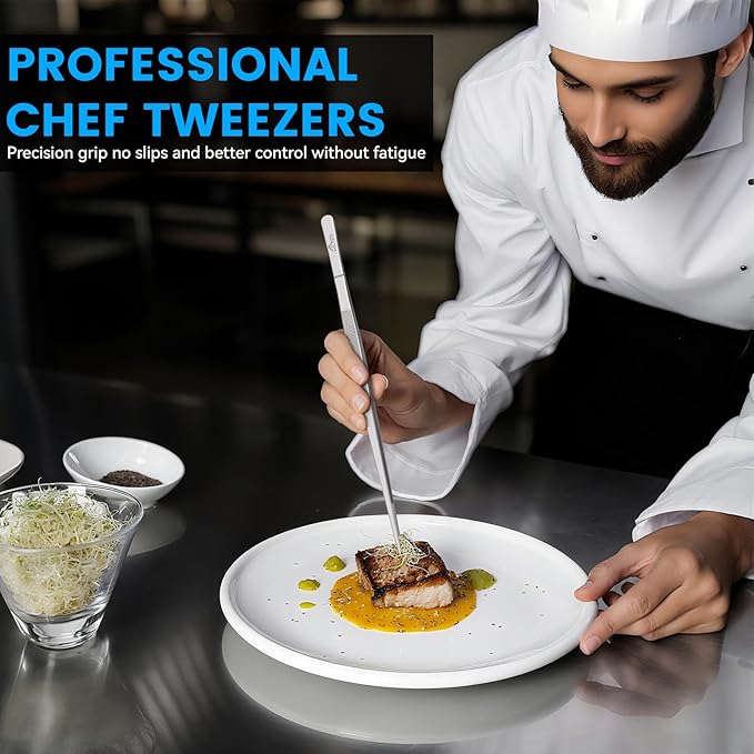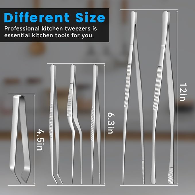 HOTEC Kitchen Tweezers Tongs Stainless Steel, Set of 6 - Professional Cooking Tweezers for Cooking, Chefs, BBQ, Seafood, Baking & Repair