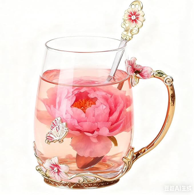 Handicraft Crystal Glass 3D Flower Cups Tea Mug With Tea Spoon Women Coffee, Tea, Juice, Beer, Milk Hot And Cold Drinks Use Gift Package. (Red-Tal)