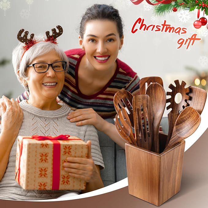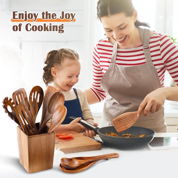 Wooden Spoons for Cooking, 11 Pcs Wood Cooking Utensils Set with Holder, Natural Acacia Wooden Kitchen Tools, Nonstick Cookware, Easy Clean, Kitchen Utensil Set for Mom, Wife Cooking Gifts