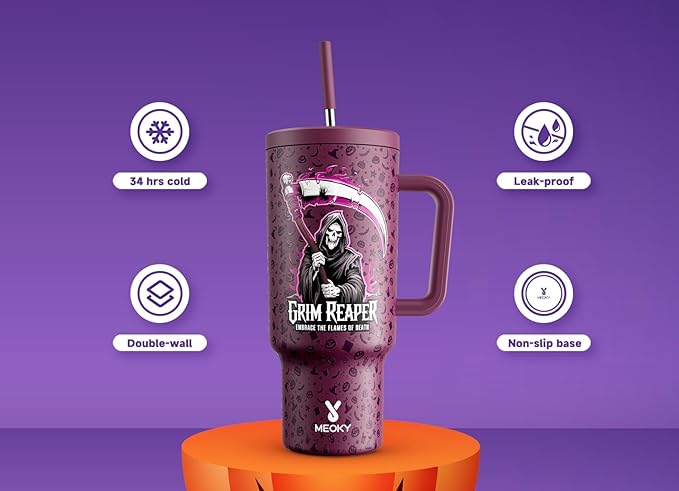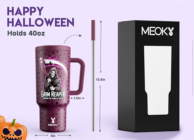 Meoky 40 oz Halloween Tumbler with Handle and Straw, Tumbler with Lid and Straw, Insulated Stainless Steel Travel Mug, 100% Leak-proof, Keeps Cold for 34 Hours or Hot for 10 Hours (Red Skull)