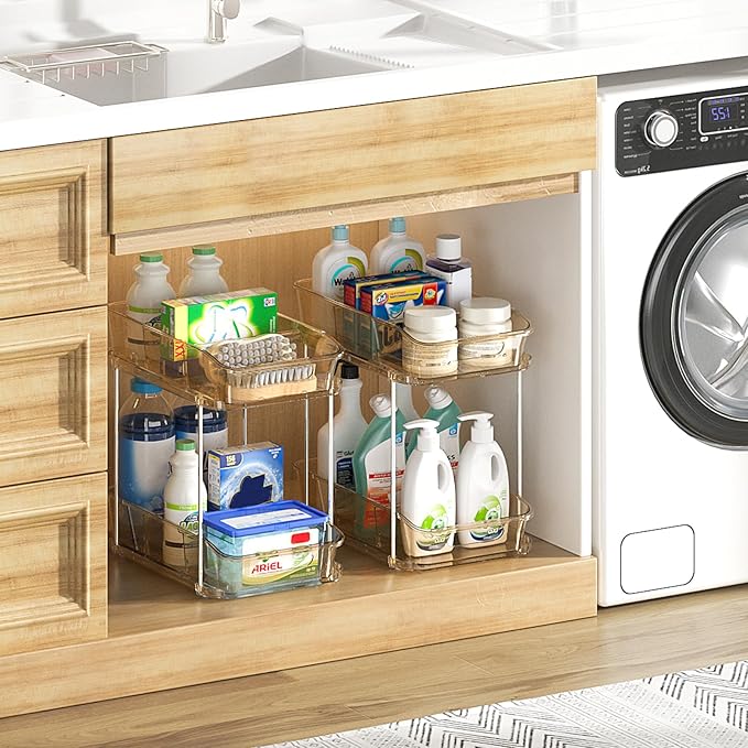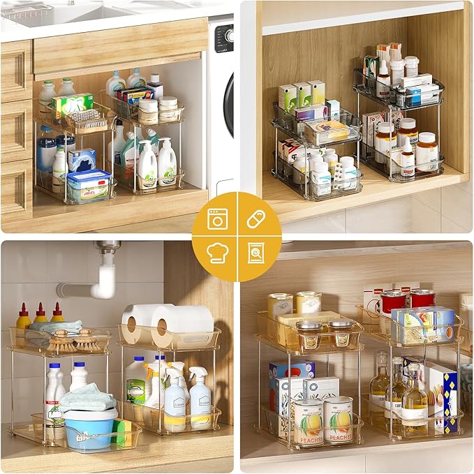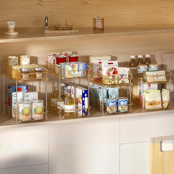 Delamu 2-Tier Under Sink Organizers and Storage, Multi-Purpose Stackable Bathroom Cabinet Organizers, Pull Out Kitchen Pantry Organization and Storage with Dividers Amber, 4 Pack