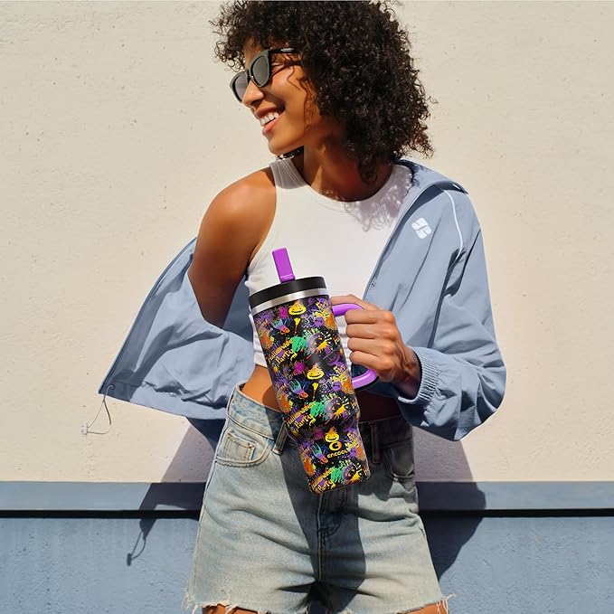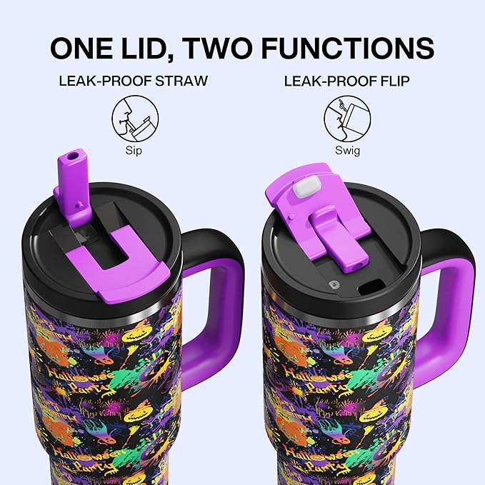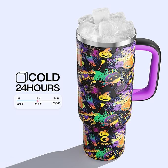ENCOOL 40 oz Tumbler with Handle and Straw: Stainless Steel Insulated Tumbler Keeps Cold for 24 Hours, Leakproof Travel Cup Fits in Cup Holder and BPA-Free, Meowgic Night