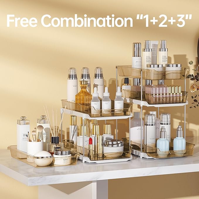 Delamu 2 Pack 3-Tier Bathroom Under Sink Organizers and Storage, Multi-Purpose Stackable Pantry Organization and Storage, Pull Out Clear Kitchen Bathroom Cabinet Organizer with Movable Dividers, Amber