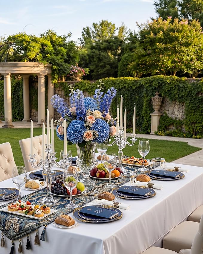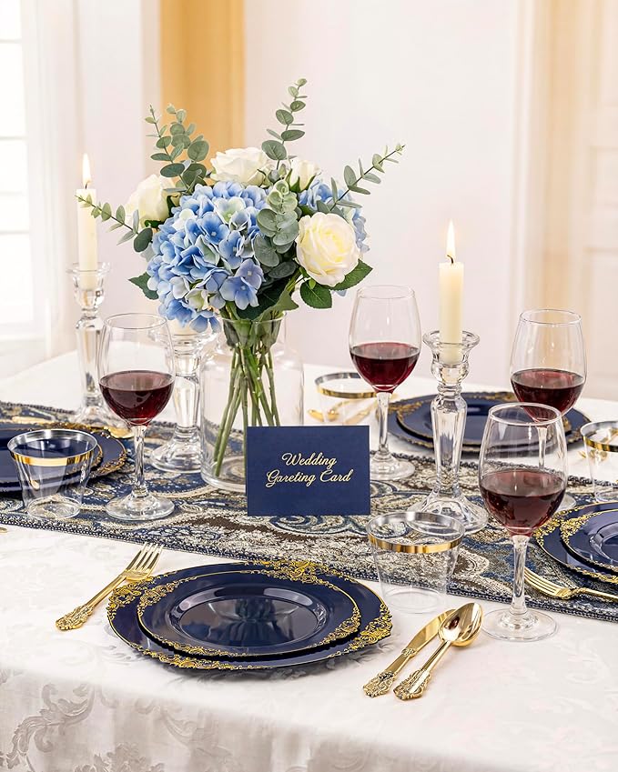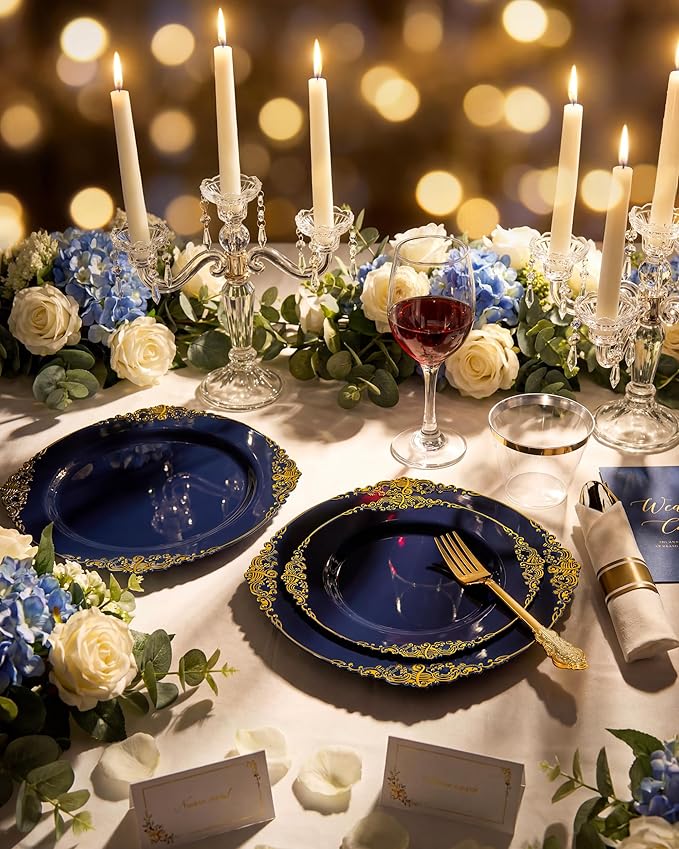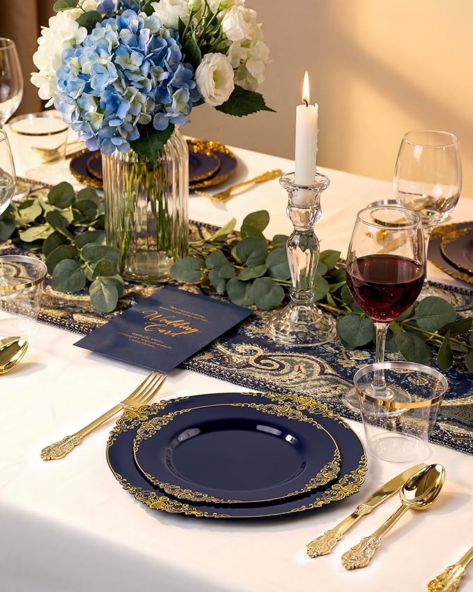 Nervure 350Pcs Blue Plastic Plates - Blue Gold Plastic Dinnerware Sets for 50 Guests - 100 Navy Gold Disposable Plates, 50 Pre Rolled Silverware, 50 Cups Perfect for Wedding & Party