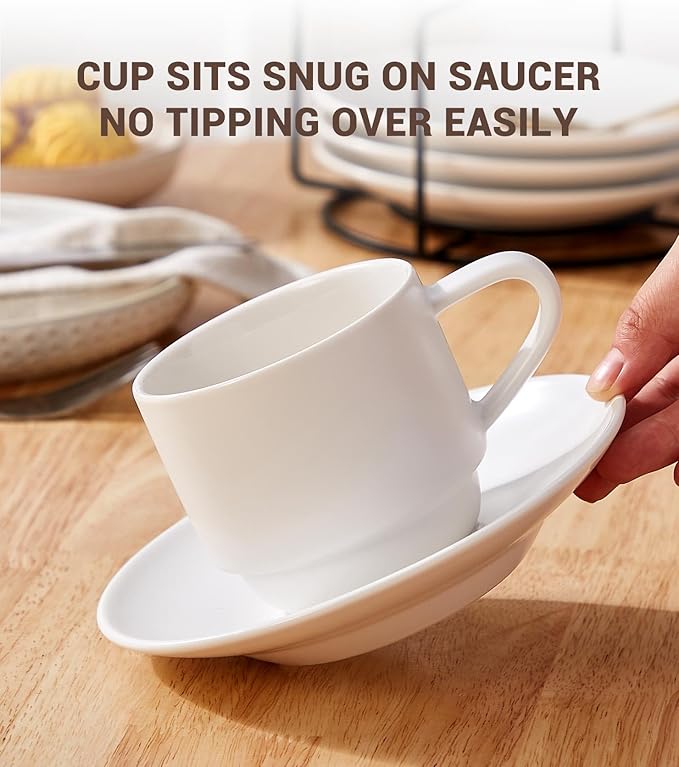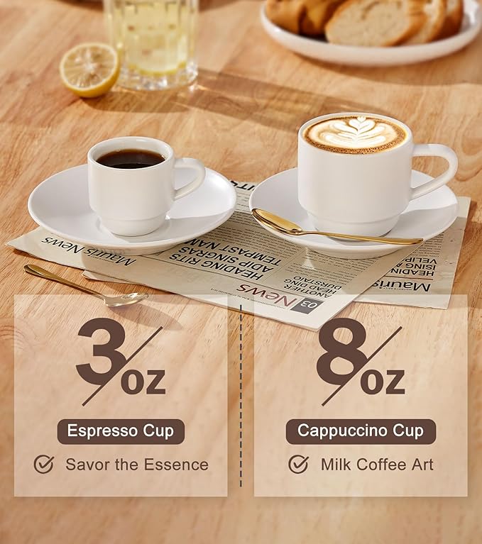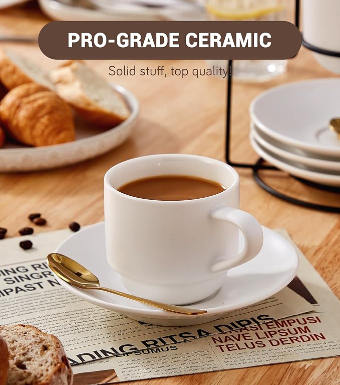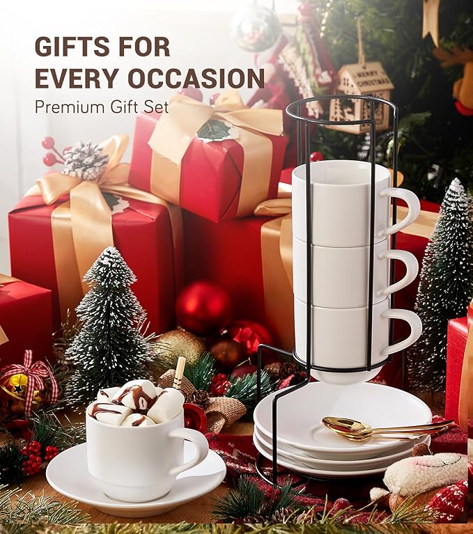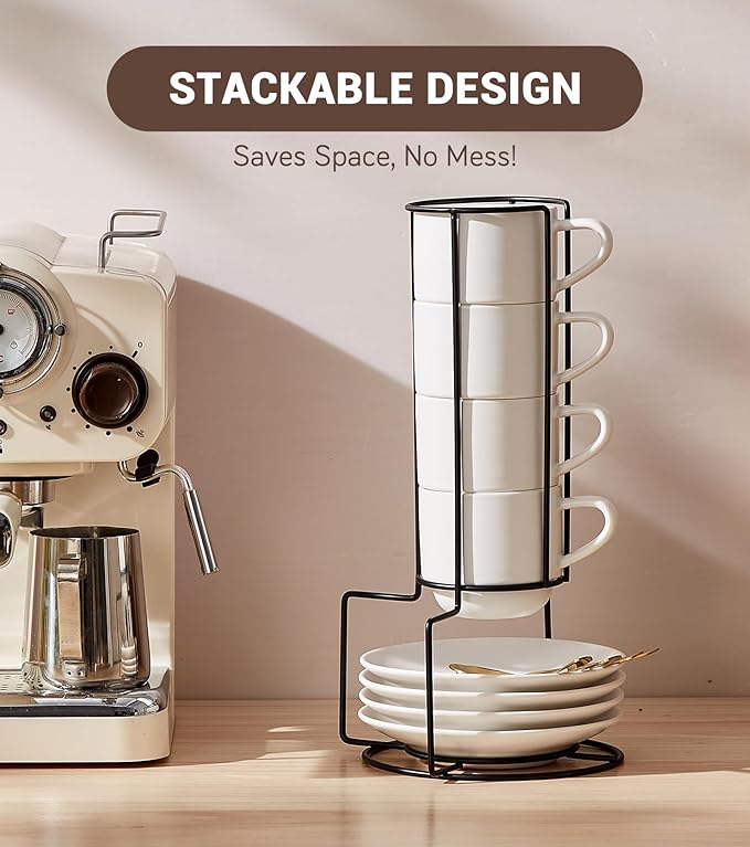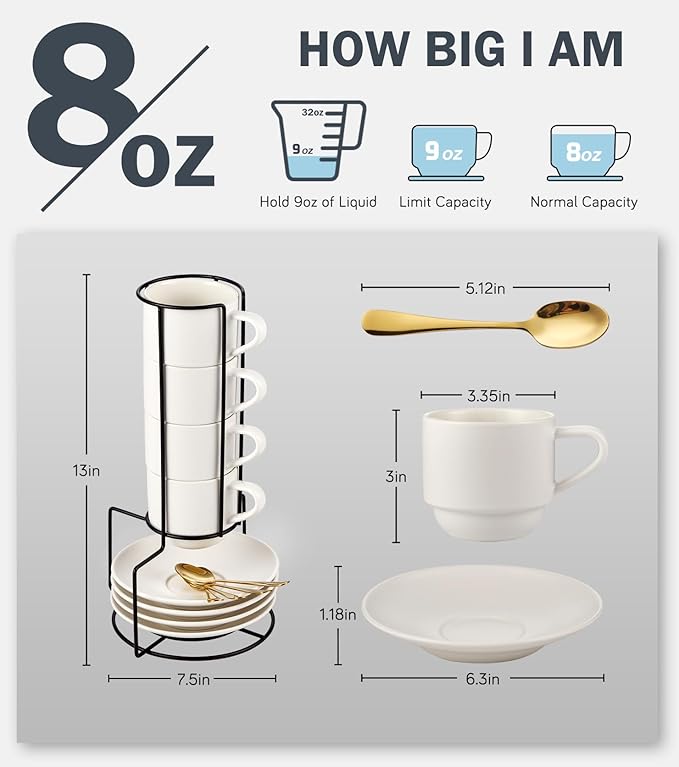 Lareina 8 Ounce Porcelain Cappuccino Cups Set of 4, Stackable Coffee Cups with Saucers, Spoons and Metal Stand -for Specialty Coffee Drinks, Cappuccino, Latte, Americano and Tea, White
