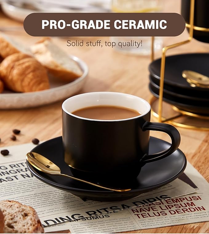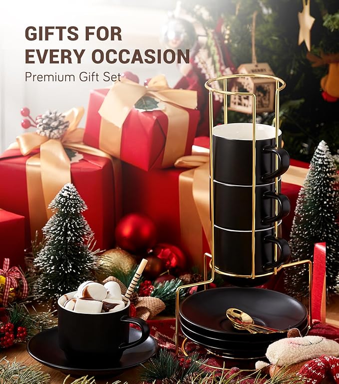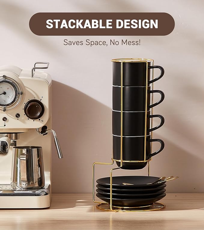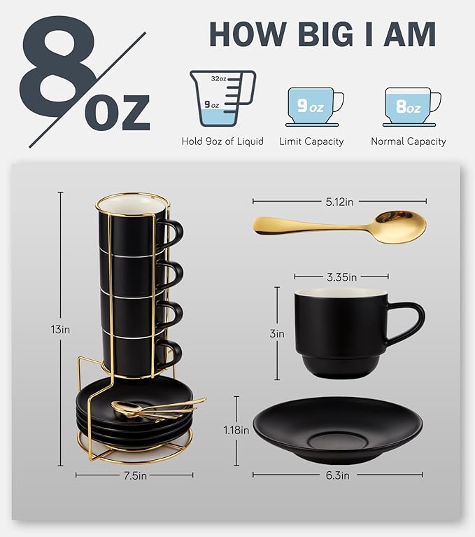 Lareina 8 Ounce Porcelain Cappuccino Cups Set of 4, Stackable Coffee Cups with Saucers, Spoons and Metal Stand -for Specialty Coffee Drinks, Cappuccino, Latte, Americano and Tea, Black