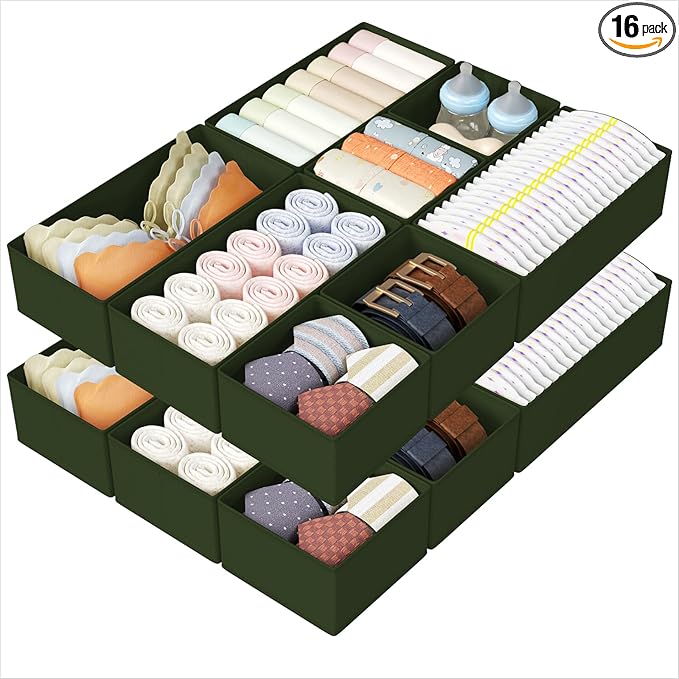 DIMJ Drawer Organizers Clothes, Set of 16 Dresser Organizer Bins, Fabric Closet Organizers and Storage, Shallow Drawer Dividers for Nursery, Clothing, Baby Clothes, Socks, Underwears, Tie (Green)