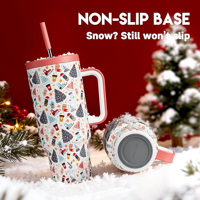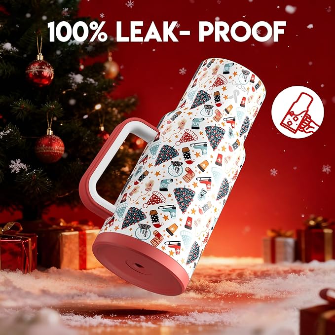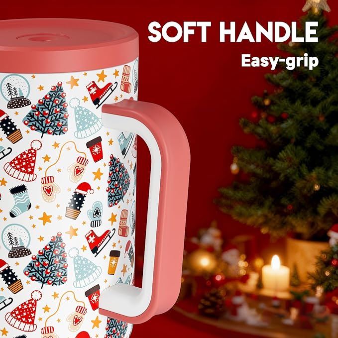 Meoky 40 oz Christmas Tumbler with Handle and Straw, Xmas Tumbler with Lid and Straw, Insulated Stainless Steel Travel Mug, Christmas Gifts for Women Men Adults (Snowy Fir)