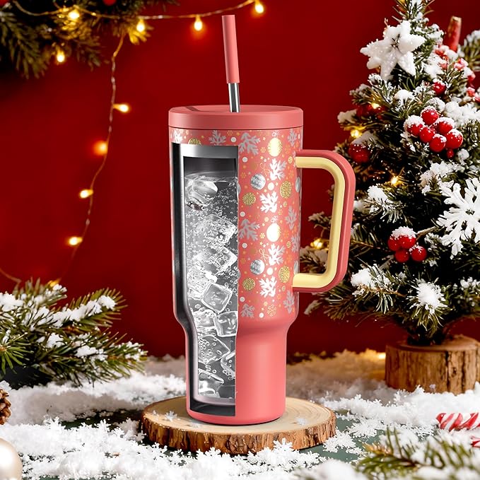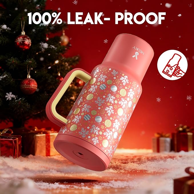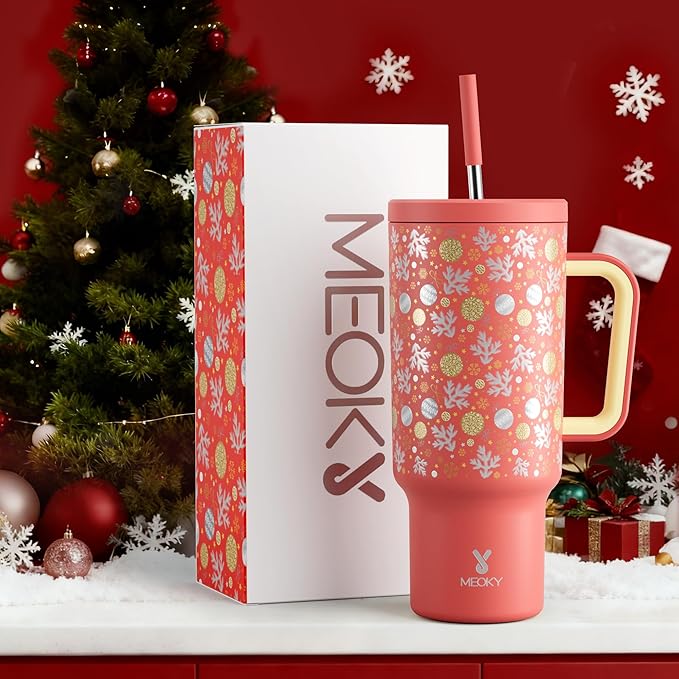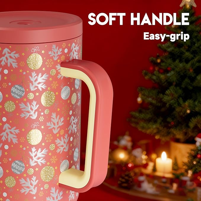 Meoky 40 oz Christmas Tumbler with Handle and Straw, Xmas Tumbler with Lid and Straw, Insulated Stainless Steel Travel Mug, Christmas Gifts for Women Men Adults (Merry Bells)