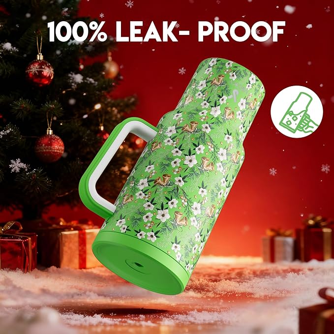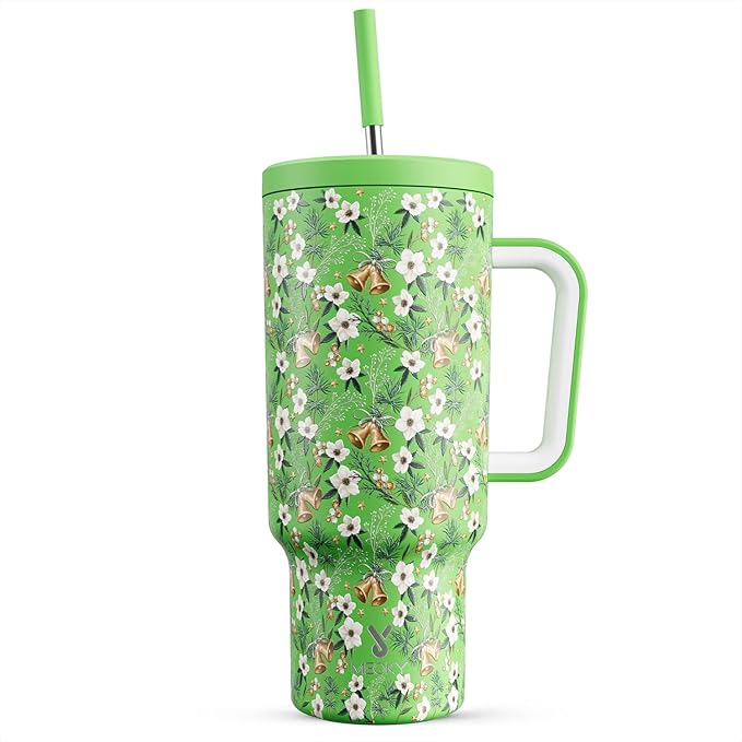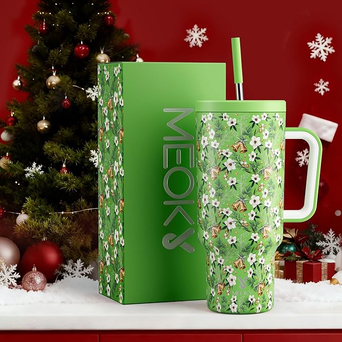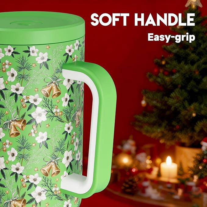 Meoky 40 oz Christmas Tumbler with Handle and Straw, Xmas Tumbler with Lid and Straw, Insulated Stainless Steel Travel Mug, Christmas Gifts for Women Men Adults (Jingle Bloom)