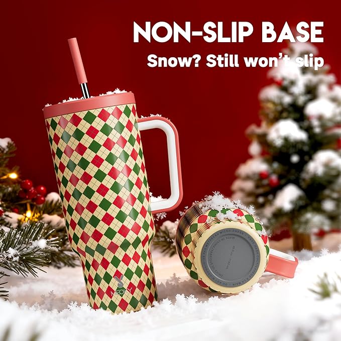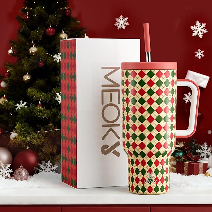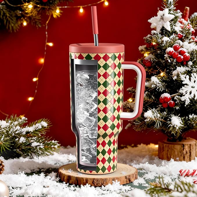Meoky 40 oz Christmas Tumbler with Handle and Straw, Xmas Tumbler with Lid and Straw, Insulated Stainless Steel Travel Mug, Christmas Gifts for Women Men Adults (Winter Plaid)