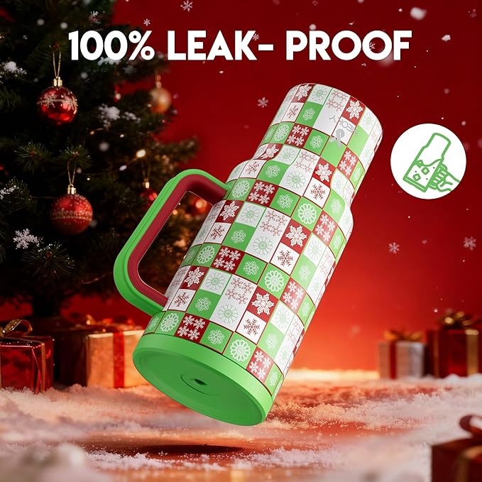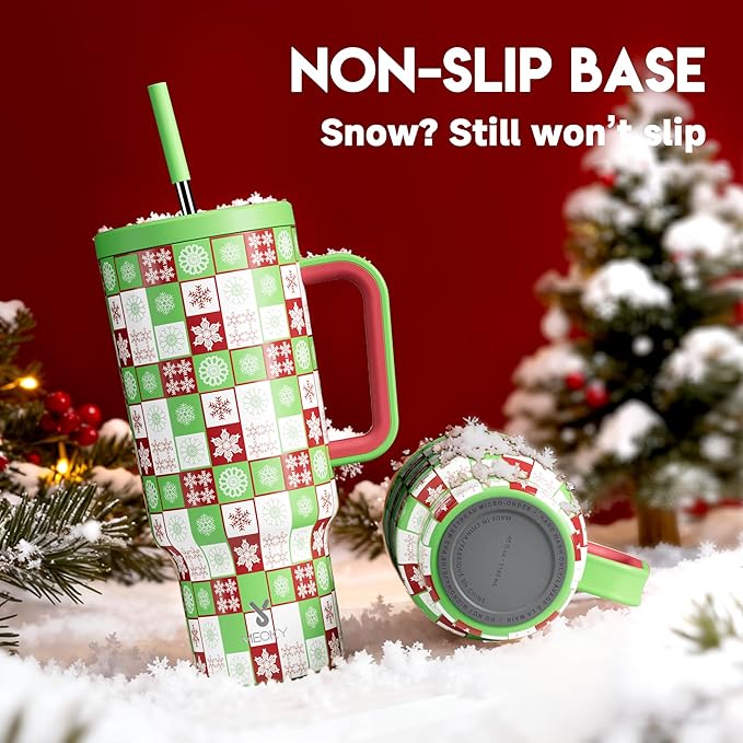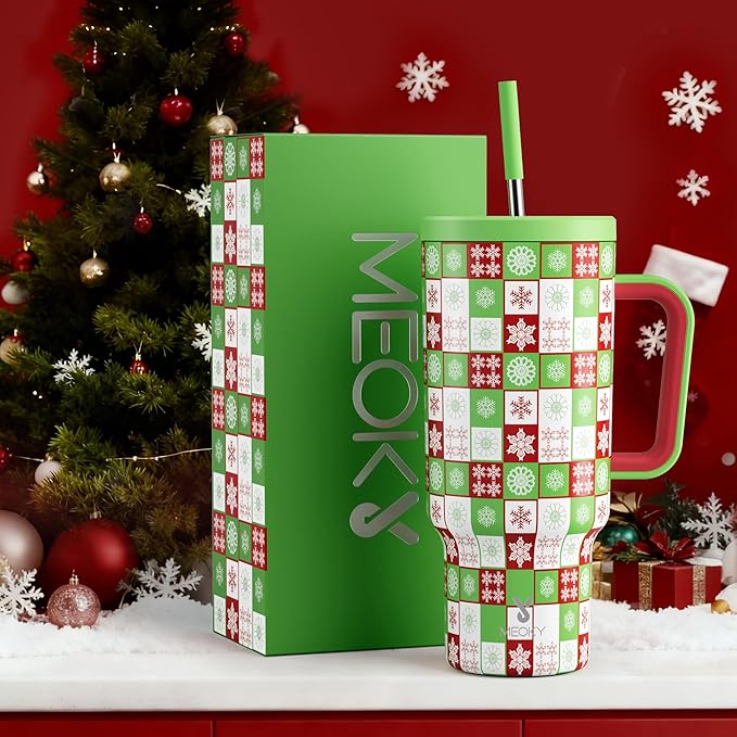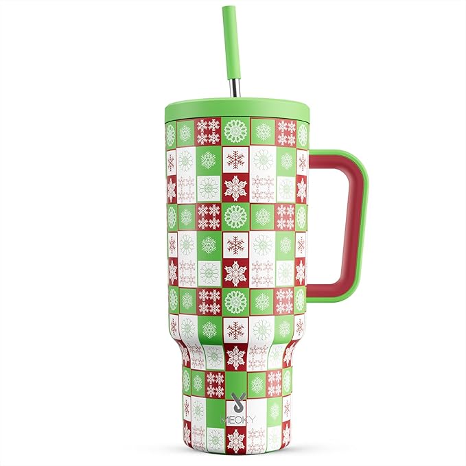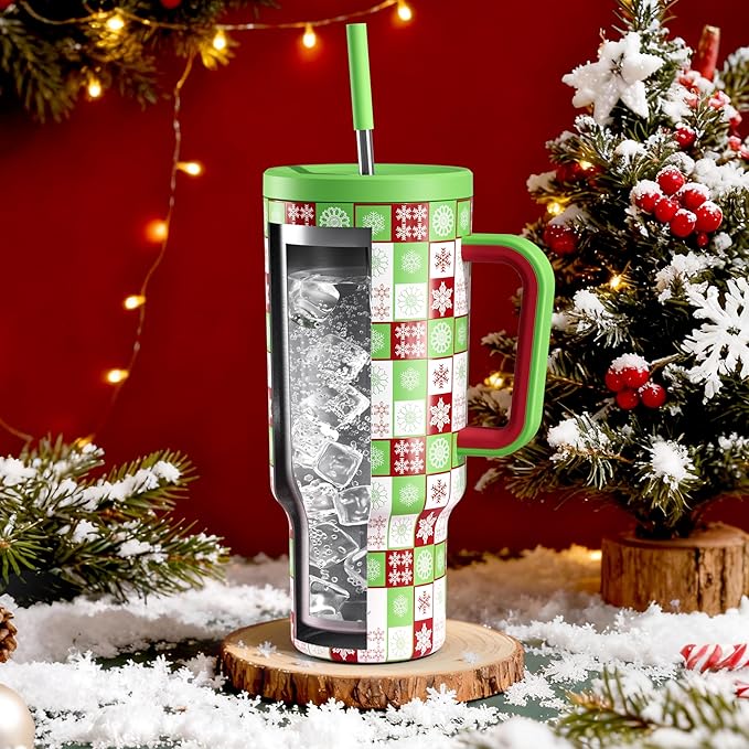 Meoky 40 oz Christmas Tumbler with Handle and Straw, Xmas Tumbler with Lid and Straw, Insulated Stainless Steel Travel Mug, Christmas Gifts for Women Men Adults (Holly Check)