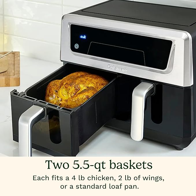 About This DUAL BASKET AIR FRYER: Cuisinart Air Fryer features two 5.5-quart baskets (11-quart total capacity) allowing you to cook... Read more
