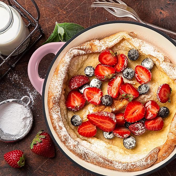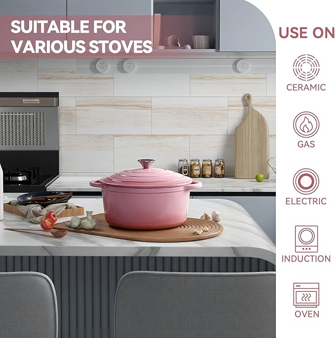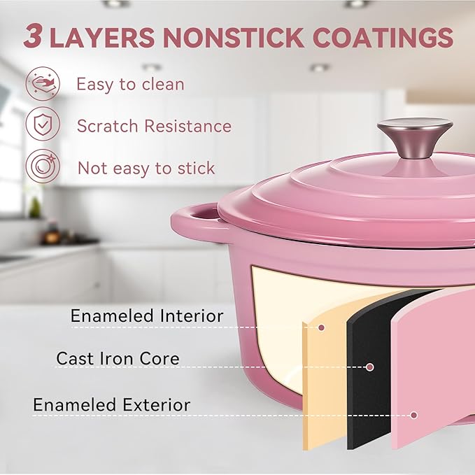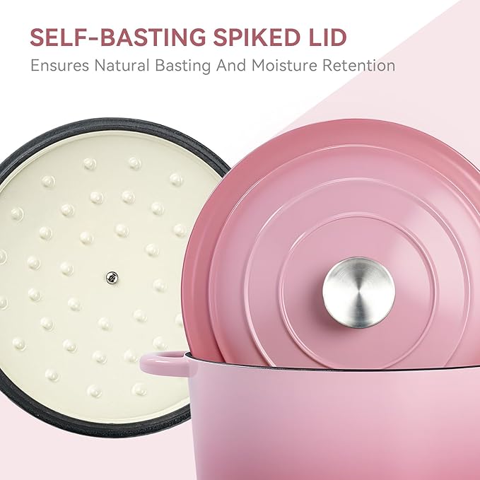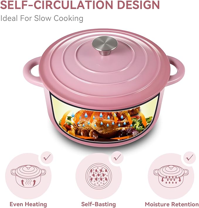 Miereirl 6 Quart Enameled Dutch Oven Pot with Lid, Cast Iron Dutch Oven with Dual Handles for Bread Baking, Cooking, Non-stick Enamel Coated Cookware, Pink