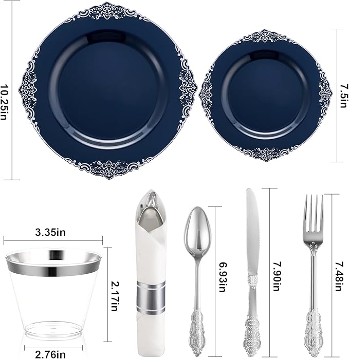700PCS Navy Blue Plates for 100 Guests, Disposable Dinnerware Sets Include 100 Plastic Plates, 100 Silverwares, 100 Cups, and 100 Pre Rolled Napkins for Party, Wedding and Graduation