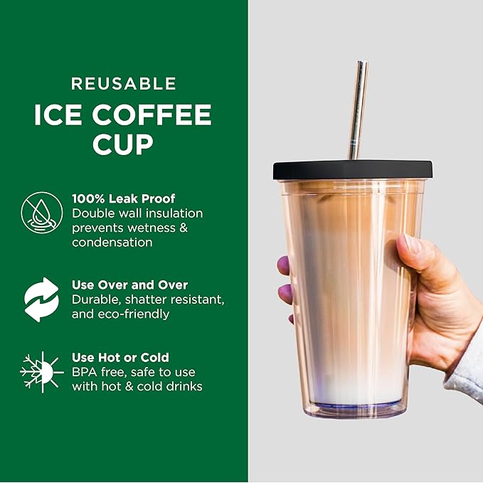 Reusable Iced Coffee Cup (24 Oz/Venti), Leak Proof and Double Wall Insulated Iced Coffee Tumbler, Come with Reusable Plastic and Metal Straws and Straw Cleaner - Black