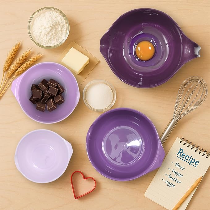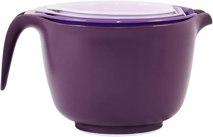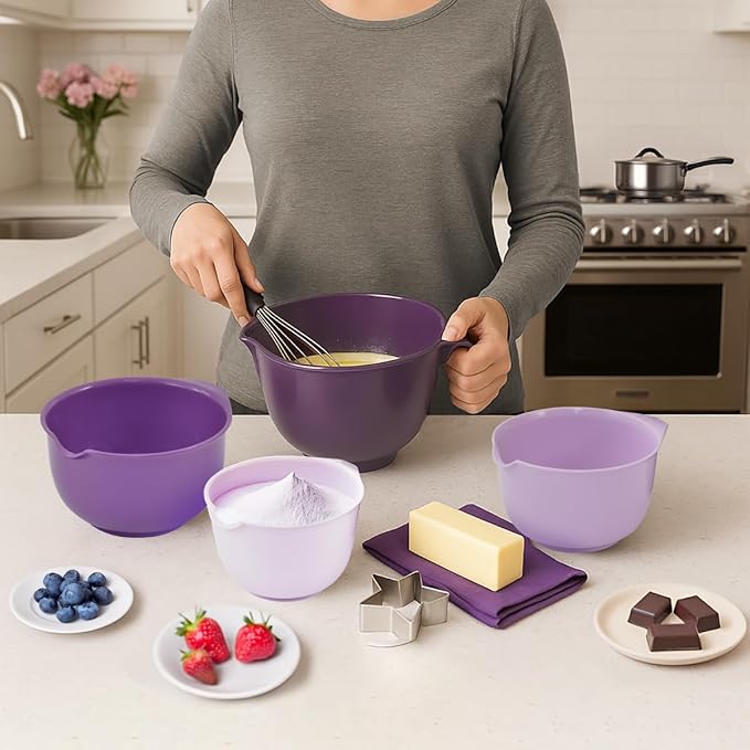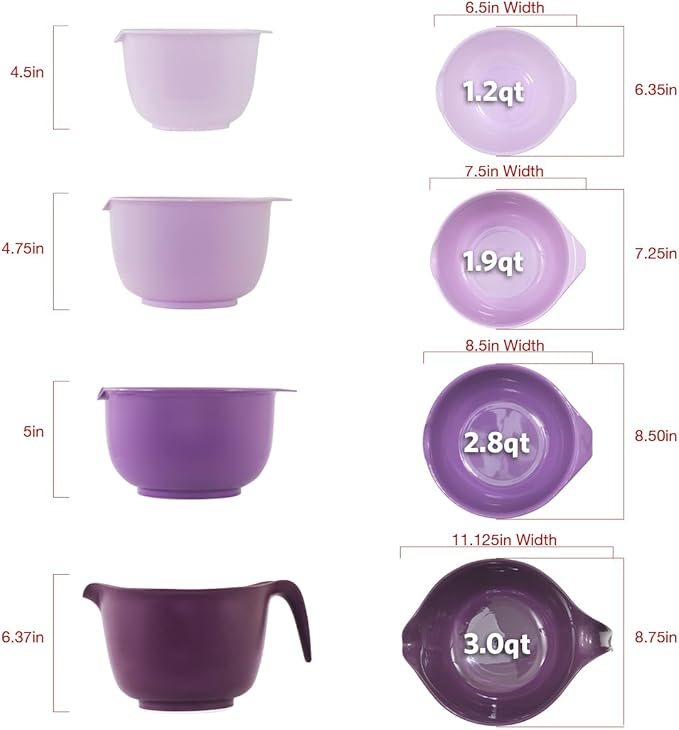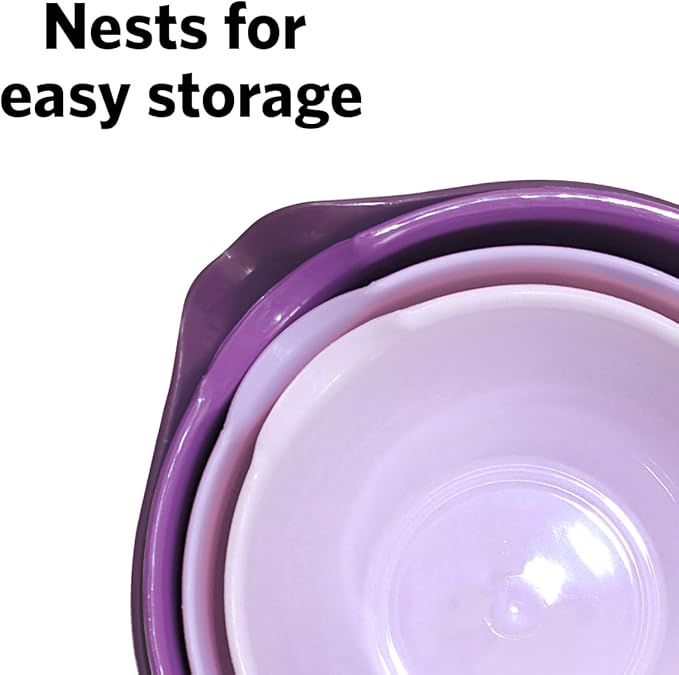 Glad Mixing Bowls with Pour Spout, Set of 4 - Nesting Plastic Bowls (1.2qt, 1.9qt, 2.8qt, and 3qt with Handle) - Non Slip Base, Dishwasher Safe Kitchen Cooking and Baking Supplies, Purple