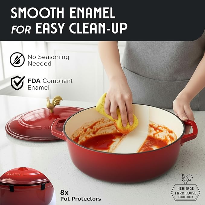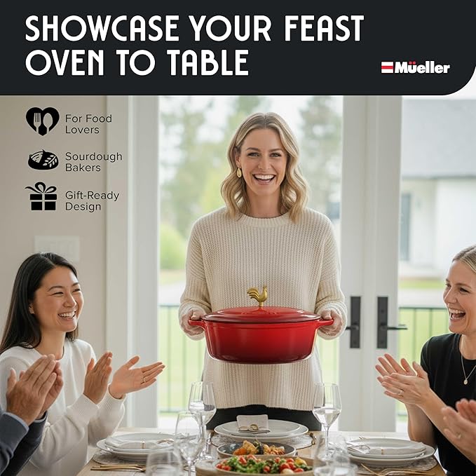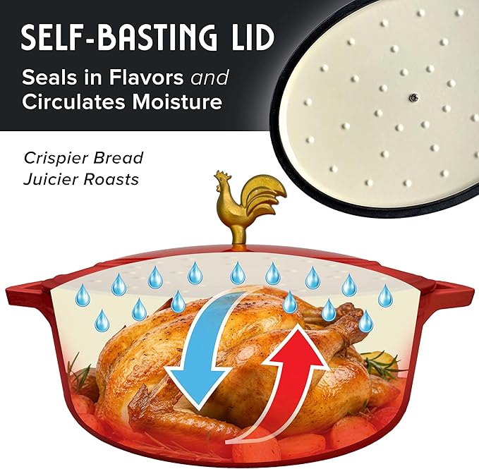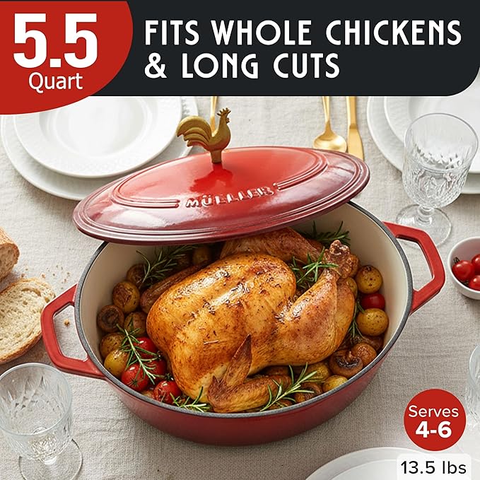 MUELLER HOME 5.5 Quart Enameled Cast Iron Oval Dutch Oven w Rooster Knob & Cotton Potholders, Heavy-Duty Cookware, Oven-Safe up to 500° F & Across All Cooktops, Gifts for Grandma & Women, Red