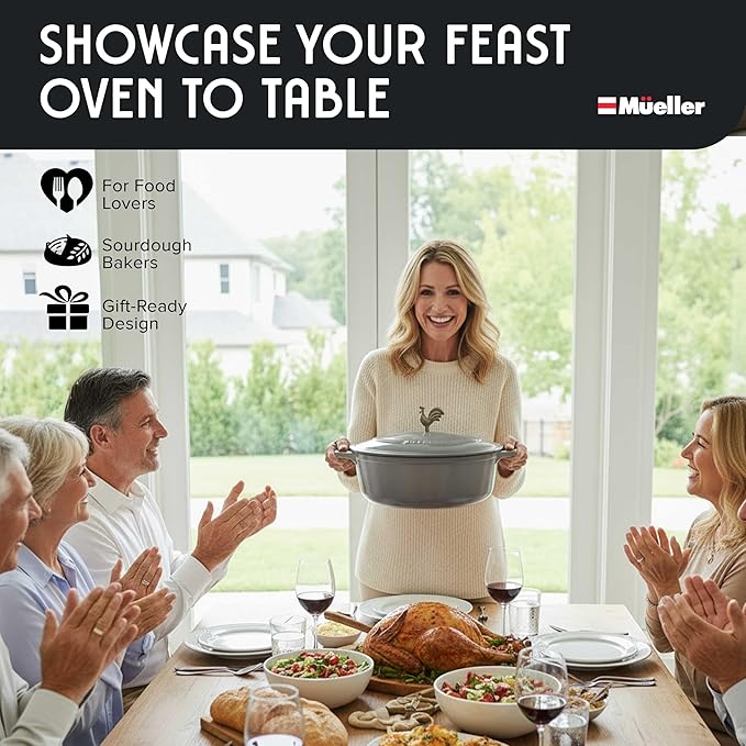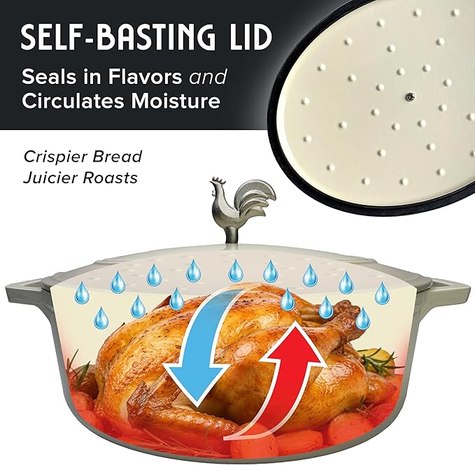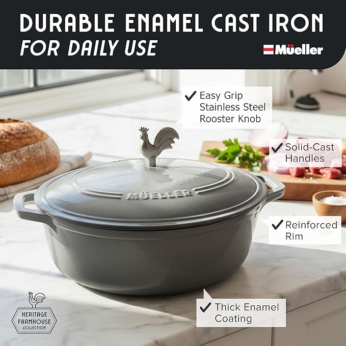 MUELLER HOME 5.5 Quart Enameled Cast Iron Oval Dutch Oven with Rooster Knob & Cotton Potholders, Heavy-Duty Cookware, Oven-Safe up to 500° F & Across All Cooktops, Gifts for Grandma & Women, Gray