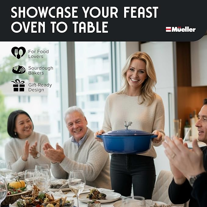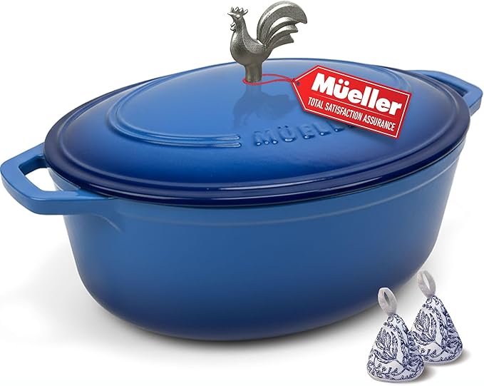 MUELLER HOME 5.5 Quart Enameled Cast Iron Oval Dutch Oven w Rooster Knob & Cotton Potholders, Heavy-Duty Cookware, Oven-Safe up to 500° F & Across All Cooktops, Gifts for Grandma & Women, Aqua Blue
