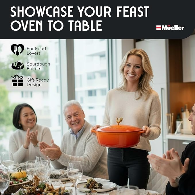 MUELLER HOME 5.5 Quart Enameled Cast Iron Oval Dutch Oven w Rooster Knob & Cotton Potholders, Heavy-Duty Cookware, Oven-Safe up to 500° F & Across All Cooktops, Gifts for Grandma & Women, Orange