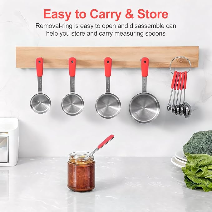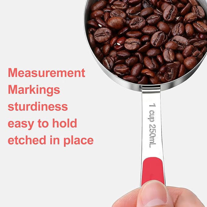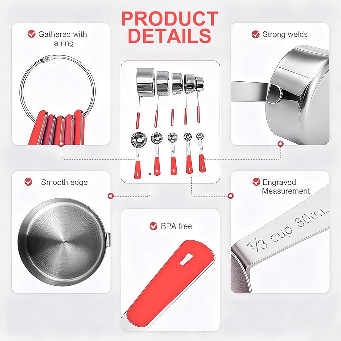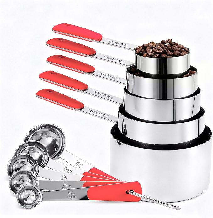 Measuring Cups and Spoons Set Stainless Steel 10 Piece for Cooking and Baking (5 Cups + 5 Spoons, Red Handle)