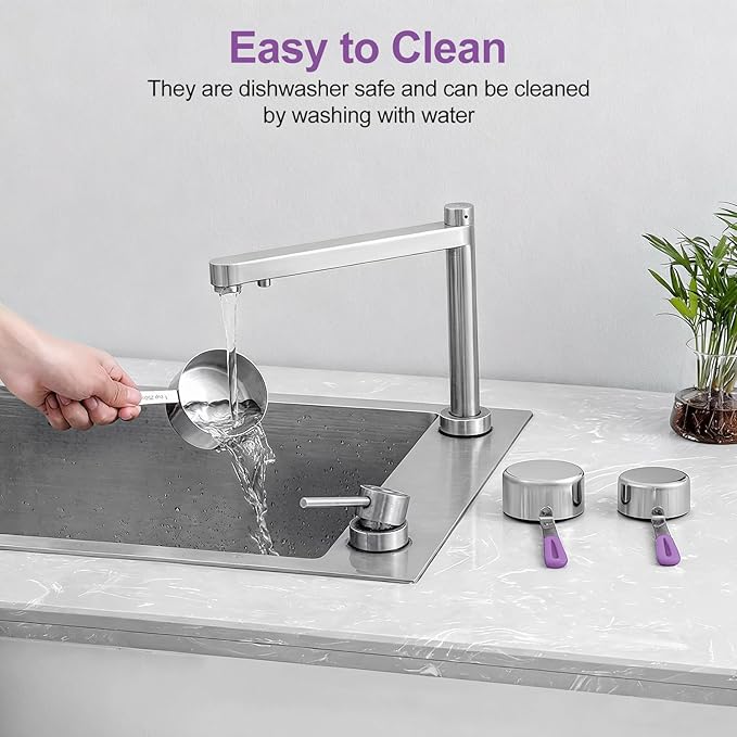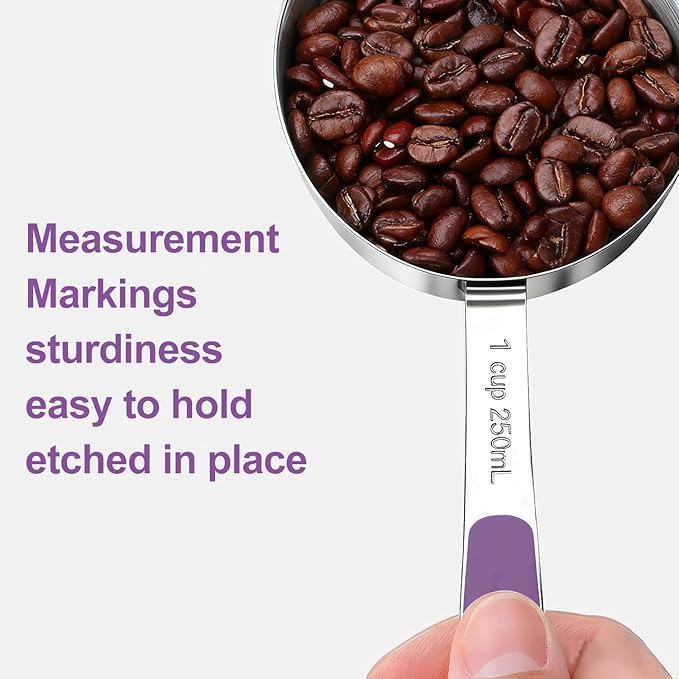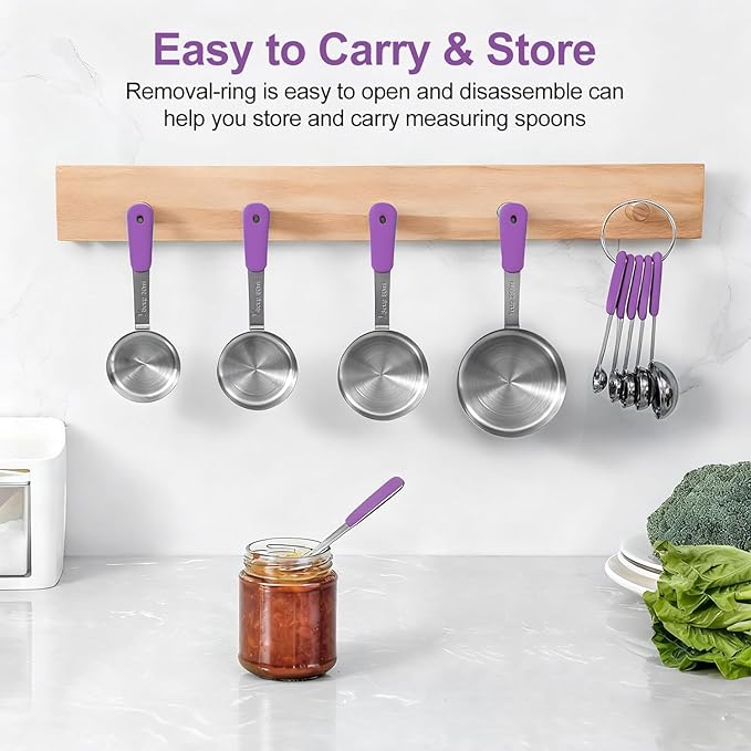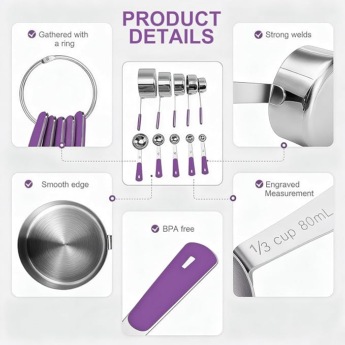 Measuring Cups and Spoons Set Stainless Steel 10 Piece for Cooking and Baking (5 Cups + 5 Spoons, Purple Handle)