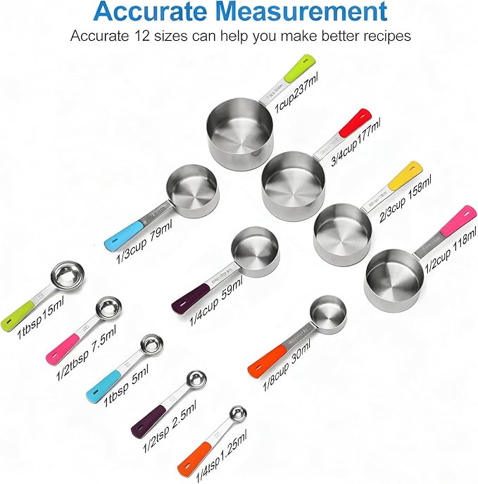 Measuring Cups and Spoons Set Stainless Steel 12 Piece for Cooking and Baking (7 Cups + 5 Spoons, Colorful Handles)