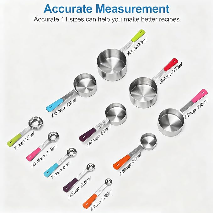 Measuring Cups and Spoons Set Stainless Steel 11 Piece for Cooking and Baking (6 Cups + 5 Spoons, Colorful Handles)