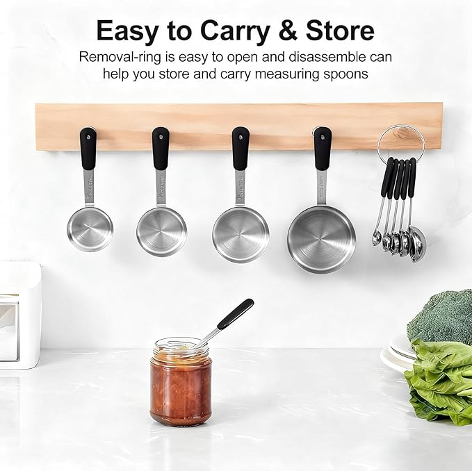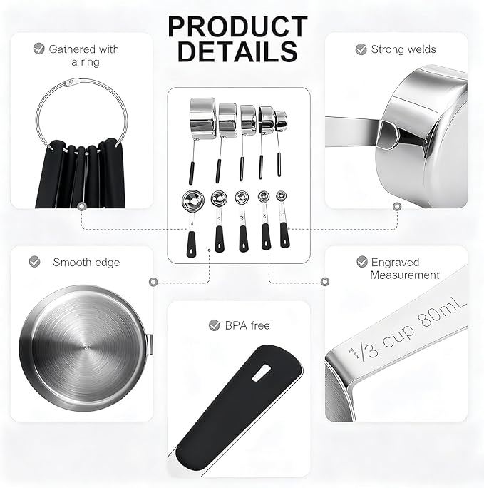 Measuring Cups and Spoons Set Stainless Steel 10 Piece for Cooking and Baking (5 Cups + 5 Spoons, Black Handle)