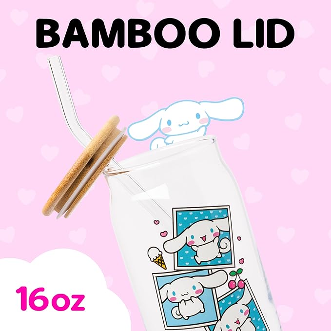 Silver Buffalo Sanrio Hello Kitty and Friends Cinnamoroll Polaroids Glass Jar Tumbler with Bamboo Lid and Glass Straw, 16 Ounces (Pack of 12)