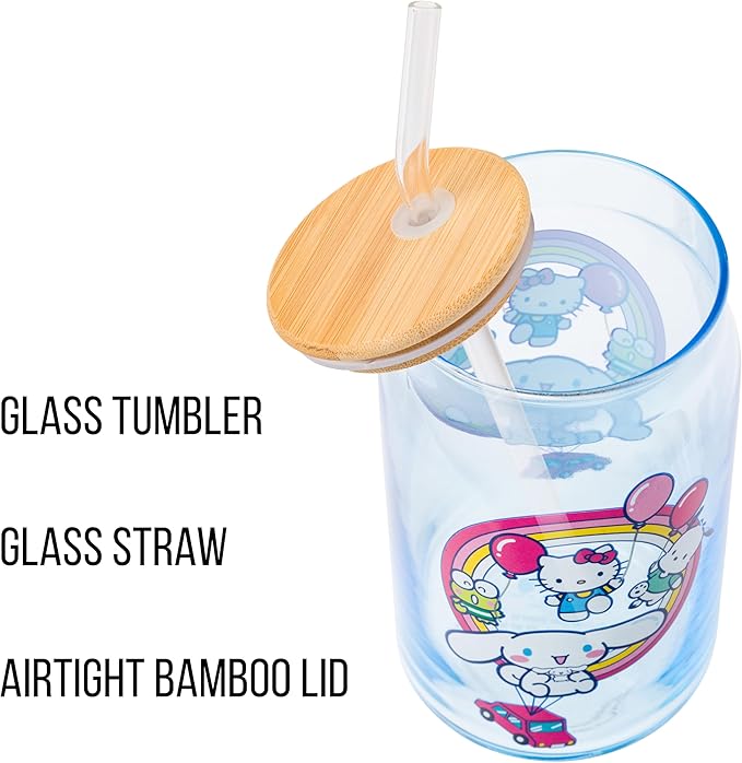 Silver Buffalo Sanrio Hello Kitty & Friends Floating Car Balloons Featuring Cinnamoroll, Pochacco, and Keroppi Glass Jar Tumbler with Bamboo Lid and Glass Straw, 16 Ounces (Pack of 12)