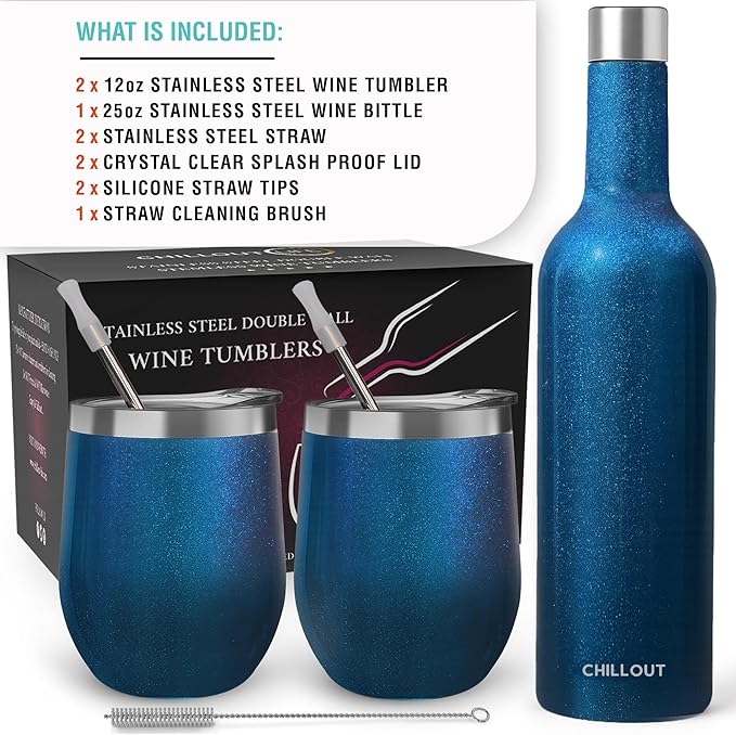 • Your 100% Satisfaction Is Our Top Notch! At CHILLOUT LIFE, we walk the extra mile to ensure our customers’ complete satisfaction. This is why we back our 1our 12 oz. stainless steel wine tumbler glass and 25 oz insulated wine bottle, with 100% satisfaction guarantee and prompt, friendly Customer Service, to help you buy with confidence. If you are not positively thrilled with our set, just let us know and we will make things right for you! - Hassle free!
