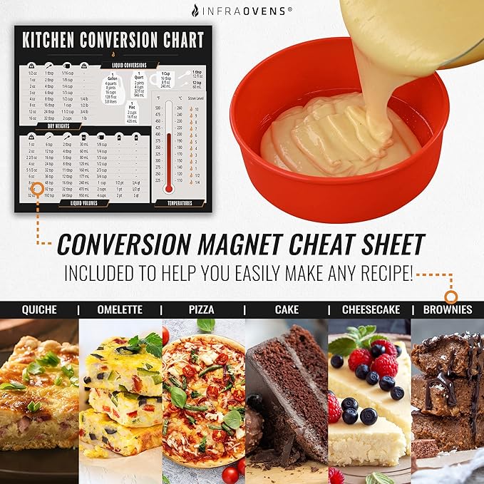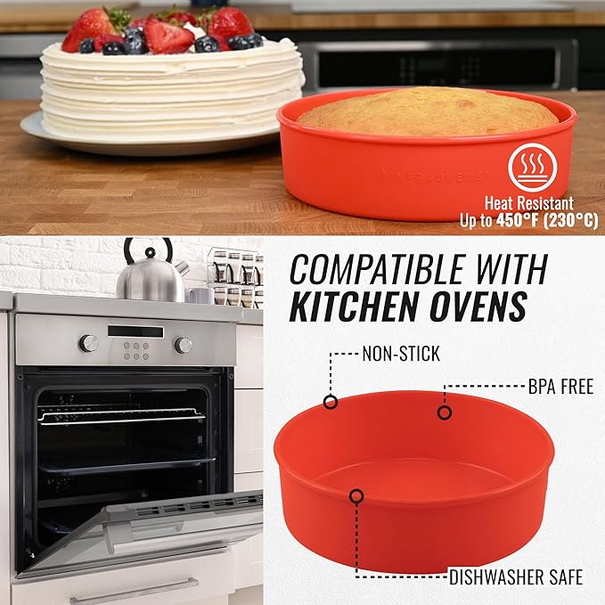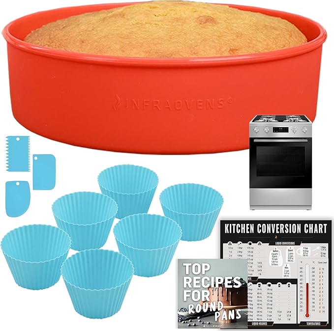 INFRAOVENS Round Silicone Cake Pan and Cupcake Liners – Nonstick Molds for Baking with Kitchen Conversion Chart and Recipes Booklet, BPA Free, 9.5 inch