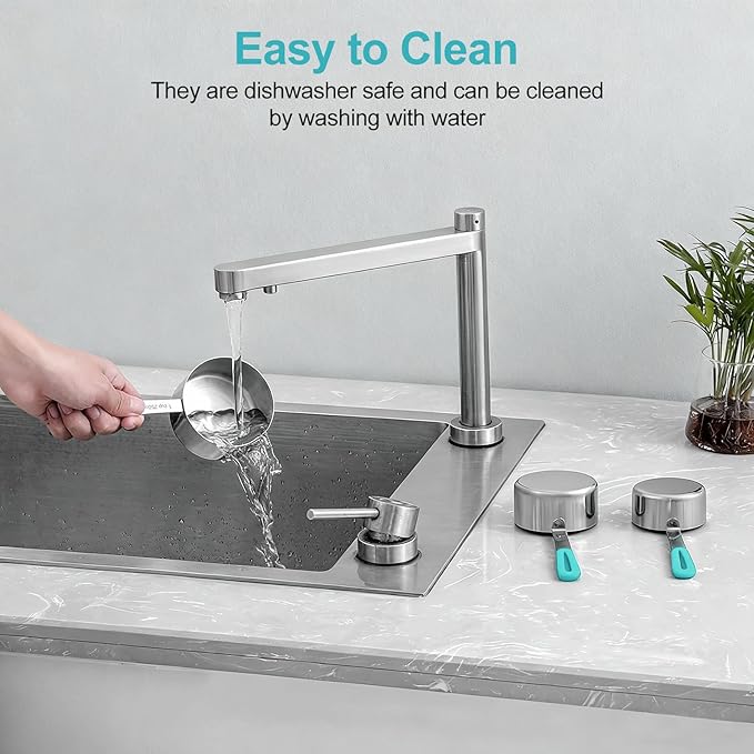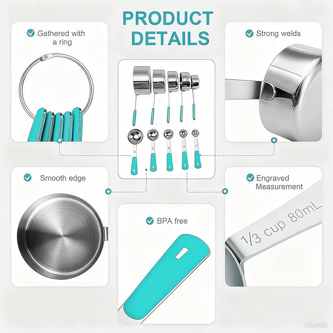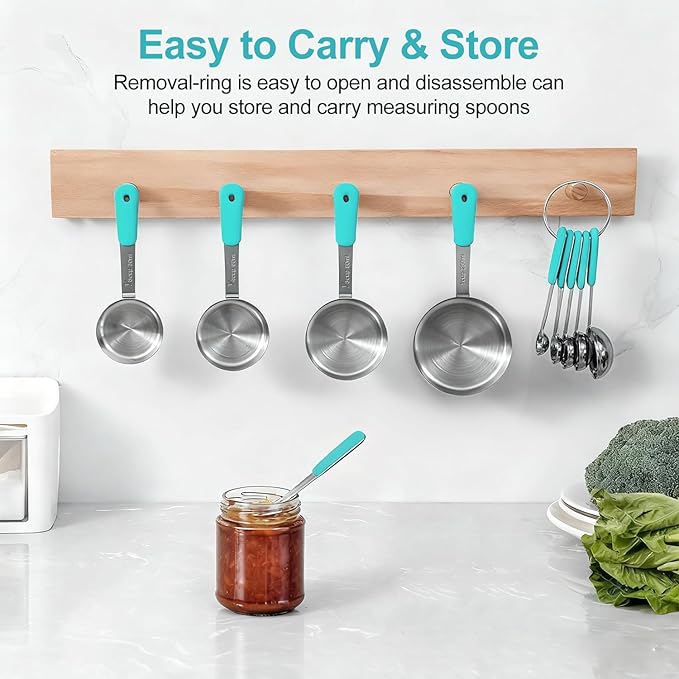 Measuring Cups and Spoons Set Stainless Steel 10 Piece for Cooking and Baking (5 Cups + 5 Spoons, Aqua Sky Handle)