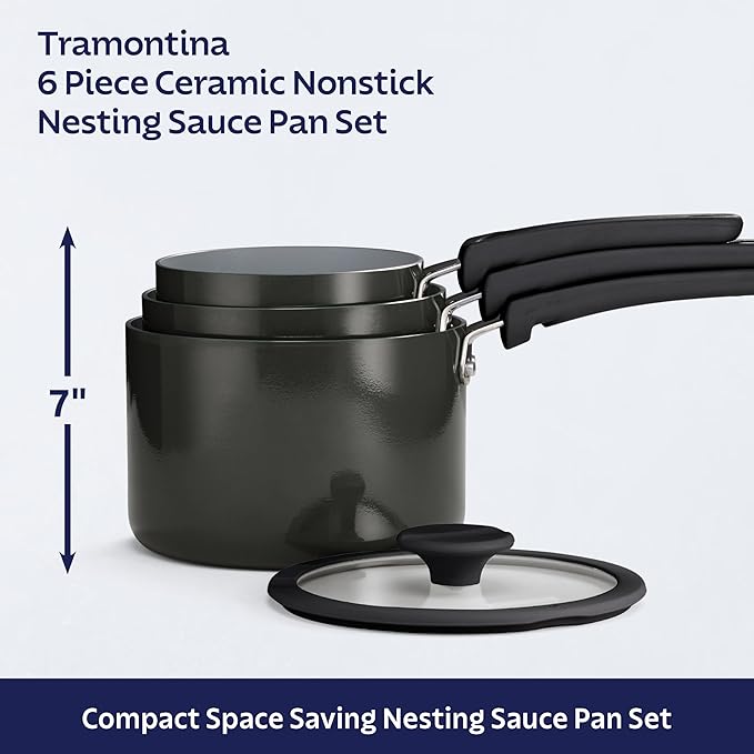 Tramontina Ceramic Non Stick 6-Piece Nesting Sauce Pan Set with Lids - Stackable Nonstick Cookware Set, Dishwasher and Oven Safe, Dark Gray