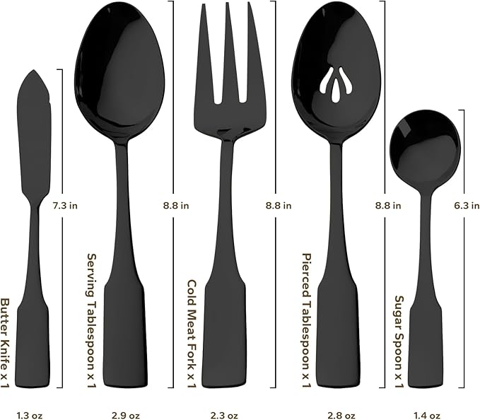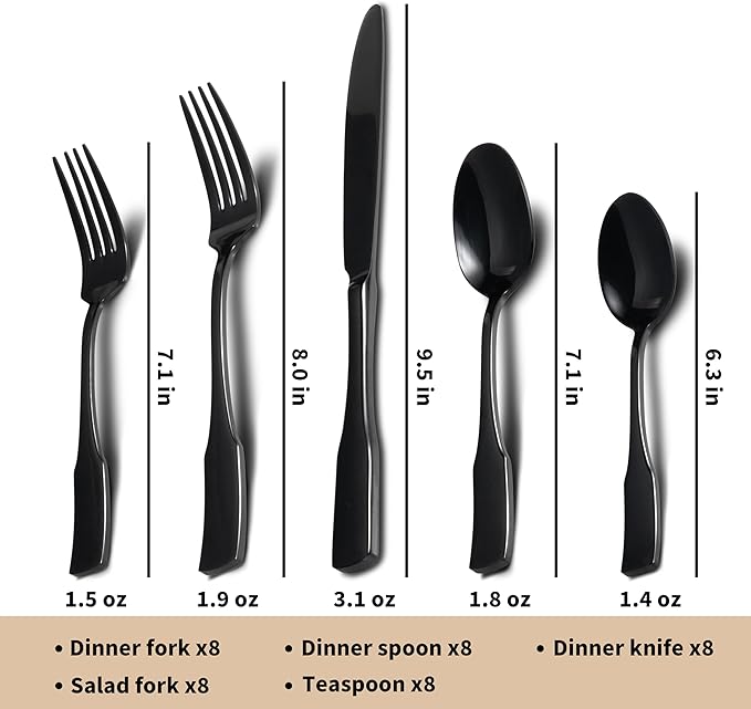 About This FLATWARE SET FOR 8: 45-piece black silverware set for 8, including 8 of each essential utensil: dinner knife,... Read more